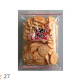 じゃがいもでん粉(じゃがいも(北海道産))、いか、えび、砂糖、しょう油(小麦・大豆を含む)、さつまいもでん粉、食塩、植物油、ワイン、でん粉糖化物、還元水飴、みりん、ごま、あおさ、かつお節エキス、昆布エキス、唐辛子、たん白加水分解物(ゼラチンを含む)、生姜/調味料(アミノ酸等)、着色料(紅麹、パプリカ色素)、甘味料(ステビア)